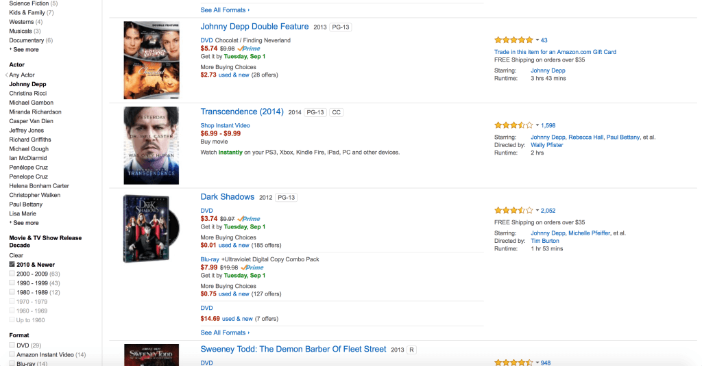 If you are searching for movies starring your favorite actors, Amazon usefully lets you narrow your search by genre, co-star and release date – and does not lose your place in your search if you explore an item further.