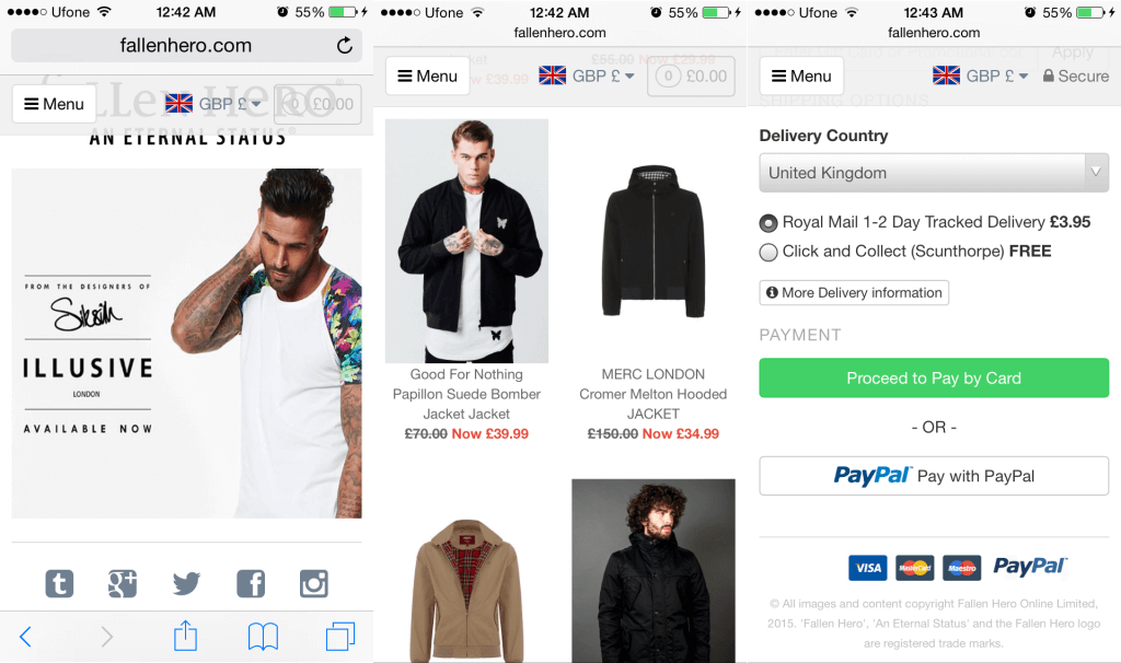 The Fallen Hero mobile website makes it easy to browse and view products and offers a no-hassle check out page that provides the delivery and payment options right there in the cart view page.