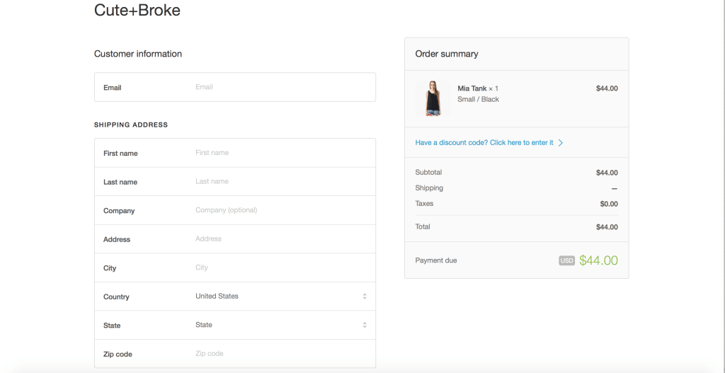 British brand Cute+Broke sells just a few key pieces and keeps the clutter at a minimum in its Shopify-hosted check out page. Even if you use Shopify as an enterprise selling thousands of products, your check out pages should always be kept simple and distraction-free!