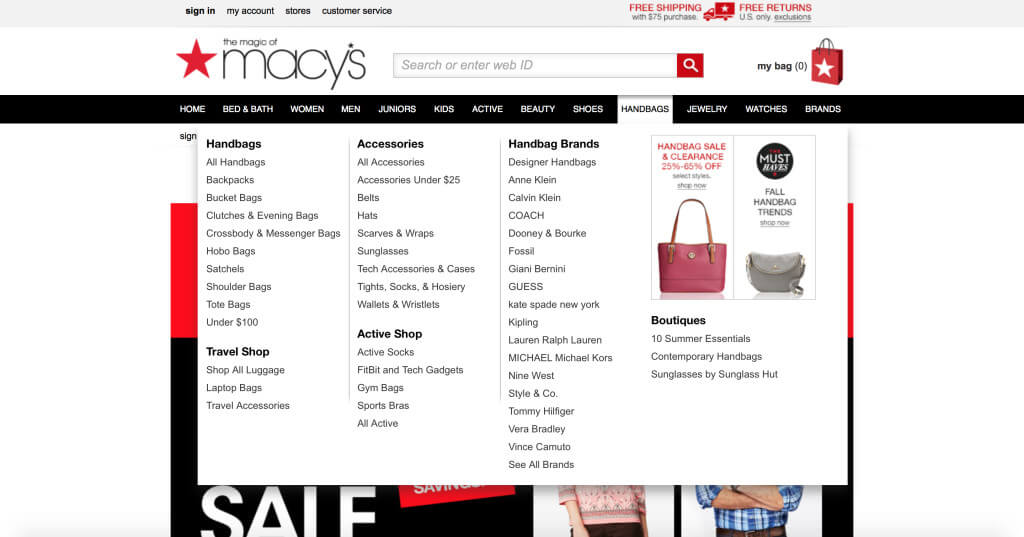 The drop-down menu lets Macy’s list all the different types of handbags as well as designer brands and accessories they carry – right from the home page.
