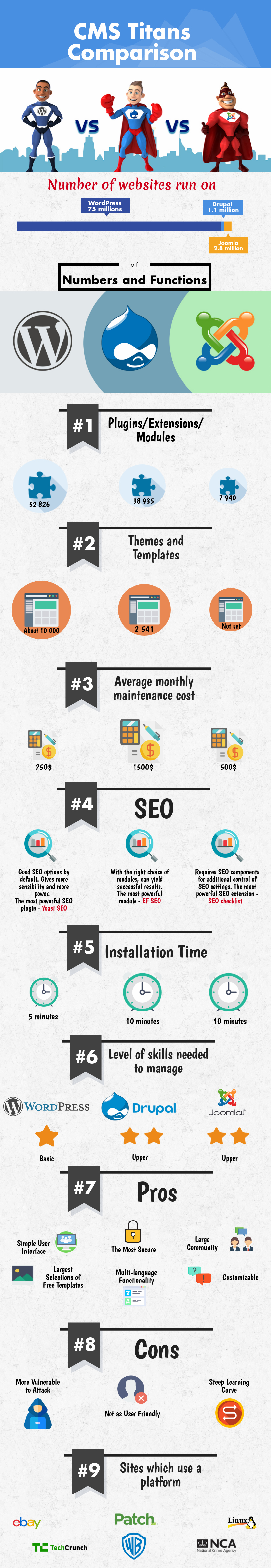 To conclude with another good news, all content management systems need some extra work or add-on SEO modules to maximize their SEO capabilities. To be specific, designers and average users swear by WordPress, while programmers and geeks drool over Drupal. Joomla meets everybody somewhere in the middle. Which one is the best is quite a loaded question because there really isn’t a best – there’s only the best for the situation you’re in. Consequently, take your time to evaluate your experience, requirements, and budget and make probably the most important decision in your life. Prefer watching to reading? Check the infographic below and find the detailed comparison of three the most spoken-about content management systems.