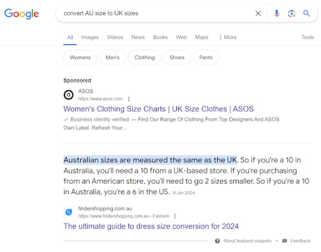 Here’s an example of a Featured Snippet when typing in the query ‘convert AU size to UK size’.