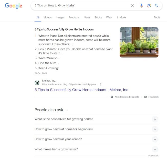 For instance, if you owned a garden center and wanted to increase your visibility, you might publish a series of blogs about gardening, such as ‘How to Choose the Right Plant for Your Garden’’ or ‘5 Tips on How to Grow Herbs’ (see the featured snippet below based on the search term).