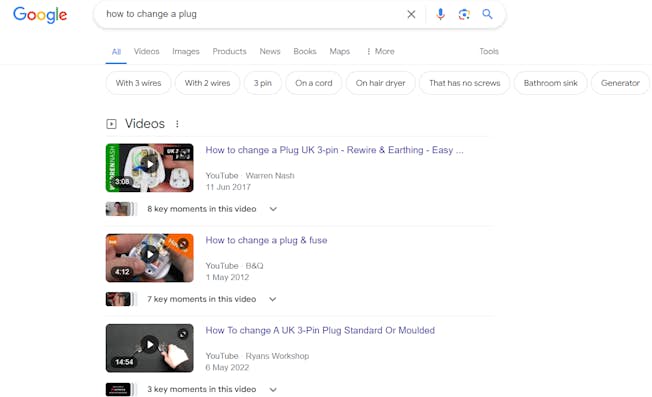 This screenshot shows what comes up on typing in ‘how to change a plug’. As this query lends itself to a tutorial, the videos get priority on the page. Keep that in mind when creating video content and optimizing it.