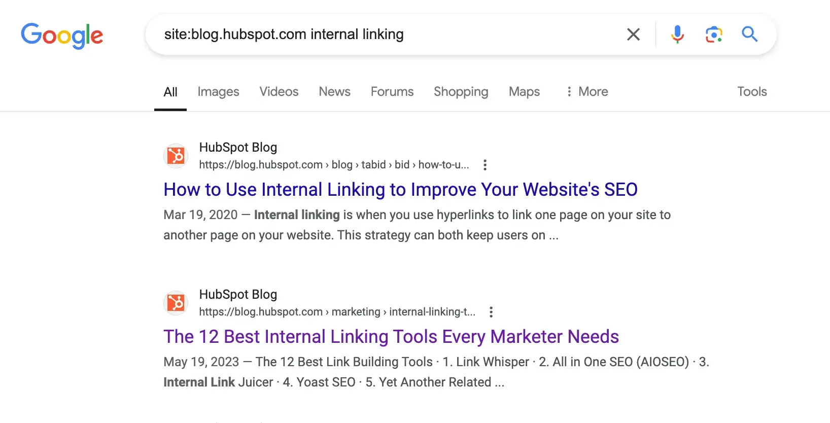 The HubSpot blogs have thousands (and thousands) of posts that predate me, so to find relevant blog content to link to, I type “site:blog.hubspot.com” into Google, followed by the term or phrase I’m looking for.