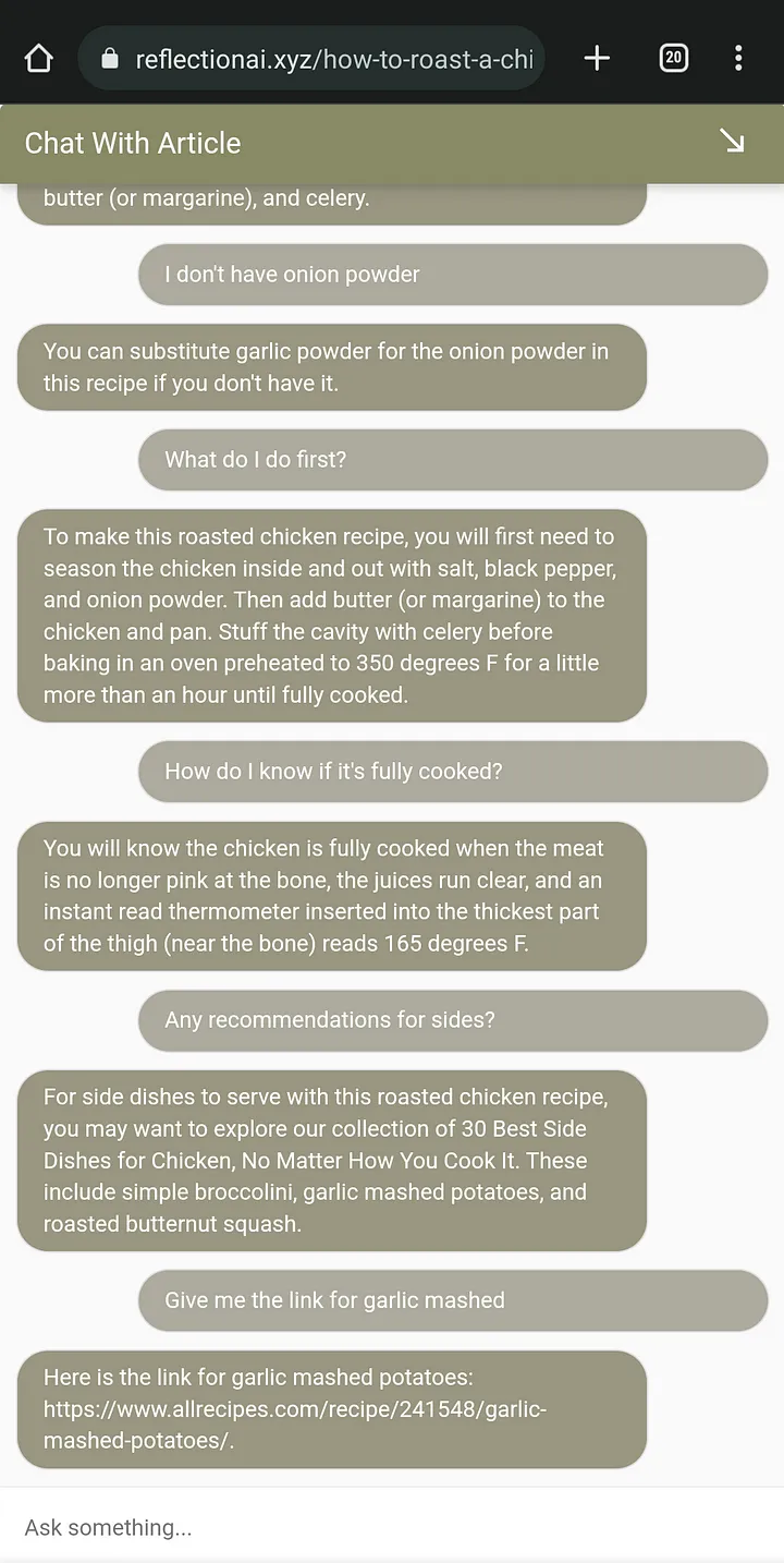 If you have other content (e.g. side dish recipes), the bot will refer to that and give you a channel for endless further engagement. Adding AI & chat to your site turns reading static content into a conversation with an expert. This will only grow as an engagement channel as AI models come more capable.