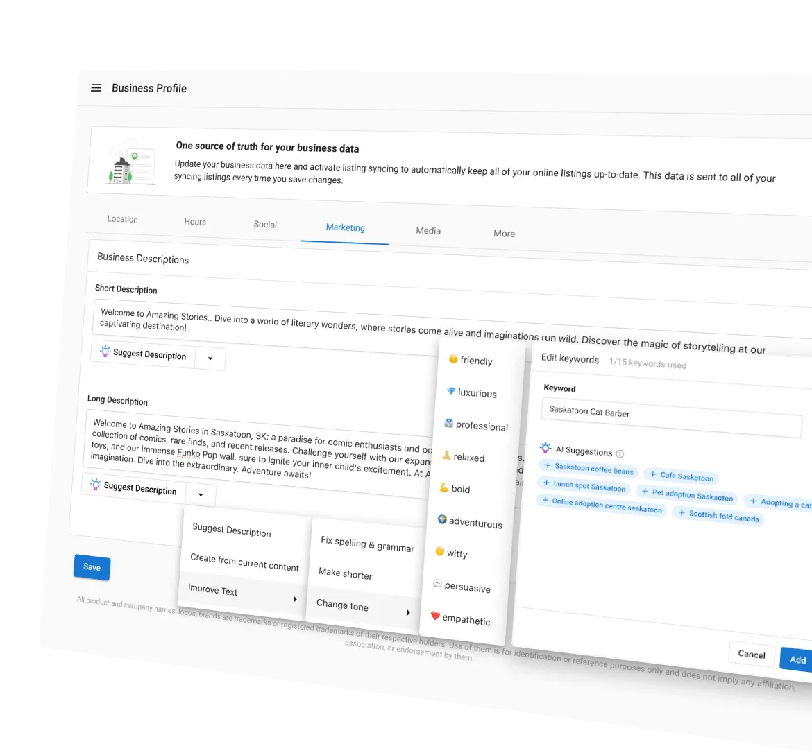 For example, Vendasta's AI SEO tools include white-label software that suggests the perfect keywords, tracks results, and creates AI-generated business profiles to improve visibility for your clients.